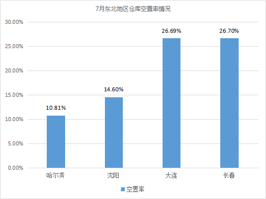 全國32個城市倉庫平均空置率為12.01%,環(huán)比上漲1.24%。其中,東北地區(qū)倉庫空置率高于其它四個地區(qū)。相較6月,東北地區(qū)倉庫空置率有所上漲,漲幅為3.37%;其它三個地區(qū)倉庫空置率波動不大。